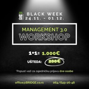 Datumi održavanja novog Management 3.0 Workhop-a su 06. i 07. decembar ove godine i ukoliko se prijavite zajedno sa kolegom, prijateljem, članom tima, oboje možete ostvariti uštedu od 100€!